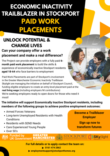 Are you a local employer passionate about making a difference in your community? SKylight and SMBC are launching the Economic Inactivity Trailblazer Paid Work Placement Programme and are looking for local businesses to offer meaningful, six month paid placements for Stockport residents who face barriers to employment.